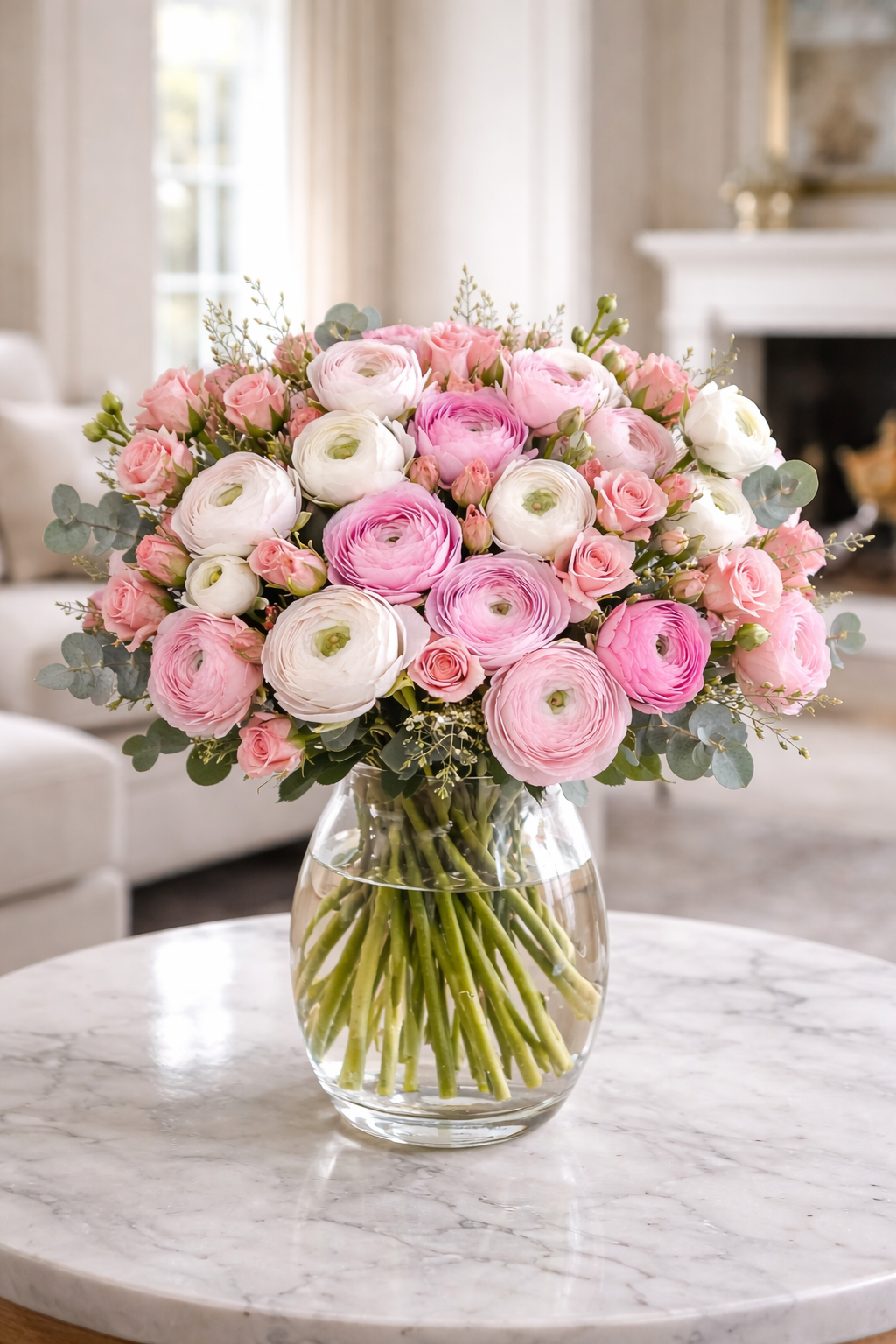 Ranúnculos y Spray roses rosado en combinación